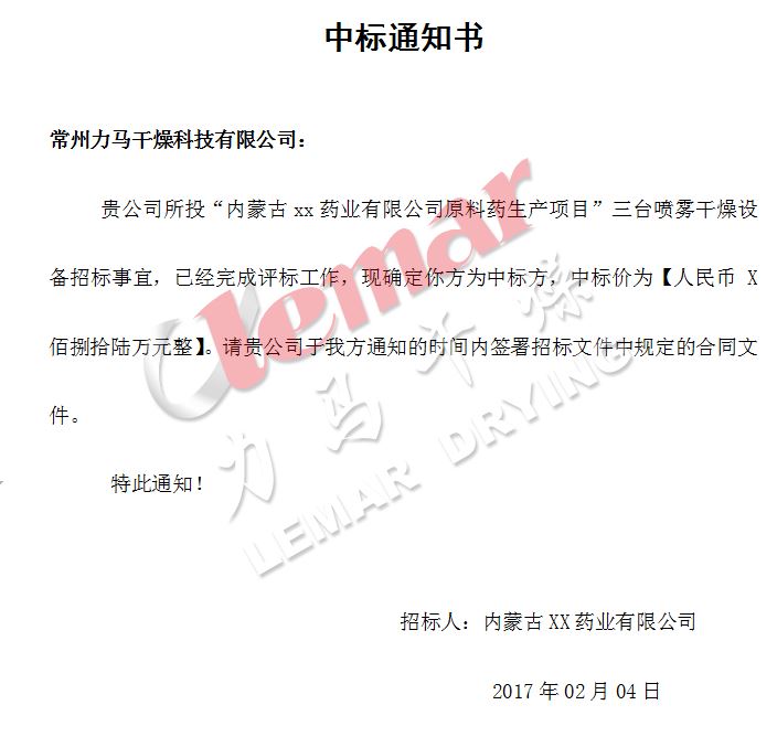 經過廣泛的調研和嚴格的測驗,內蒙古xx藥業有限公司,^終決定向常州力馬科技有限公司定購三臺原料藥噴霧干燥機,單筆金額高達百萬余元,貢獻力馬新春第一單,為力馬贏得了農歷雞年的頭彩。同時也展示了內蒙古xx藥業有限公司蓬勃的生機和迅猛的發展勢頭,真誠祝愿兩家公司合作愉快、雞年大吉。